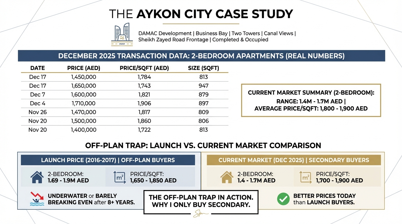I pulled the DXB Interact numbers for Business Bay last week. Specifically Aykon City — one of the area's flagship developments.