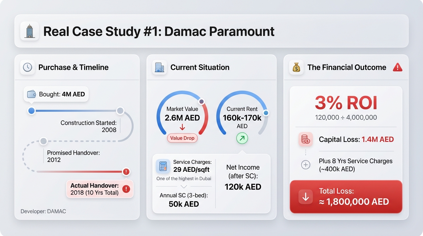 No rental income for the first 3-4 years (construction + handover delays). Then 4-5 years of collecting rent while watching the asset depreciate.